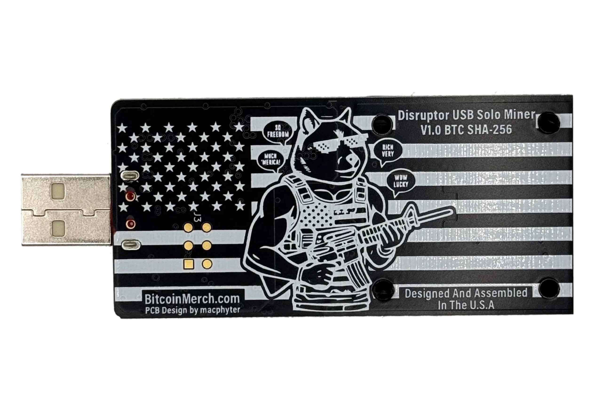 With over 300 GH/s of hashing power, the Disruptor operates at an ultra-efficient 8 to 15 watts, making it one of the most energy-efficient miners on the market today. Mine Bitcoin directly, independently, and silently — right from your home or office. - American-Made with Bold, Patriotic Design